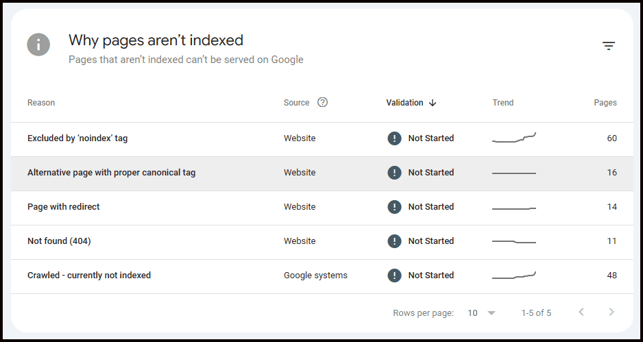 Počinjem s pregledom stranica i tražim “Crawled – currently not indexed“, što znači da je Google pronašao stranicu, ali je (iz nekog razloga) nije indeksirao.