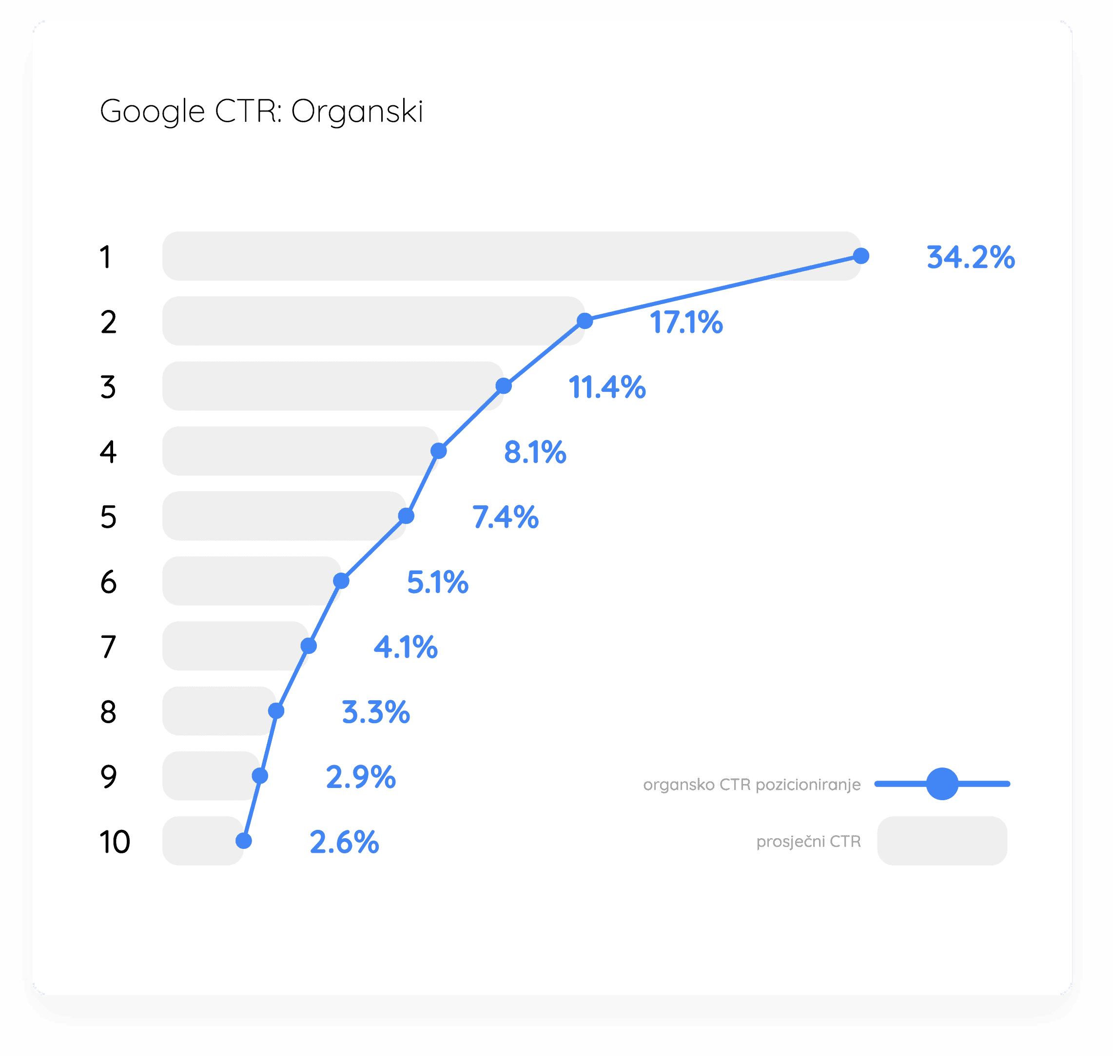 Istraživanja u 2022. godini pokazuju da oko 34,2% klikova na tražilicama kao Google.ba nakon pretrage završi na prvom rezultatu kojeg dobijemo. Taj procenat posjeta rapidno opada kao se pozicija povećava i već drugo mjesto obično donosi oko 17,1% klikova u prosjeku, što u odnosu na prvo mjesto nosi duplo manje klikova. Potom treće mjesto u prosjeku nosi 11,4% i tako dalje, broj posjeta iz organskog prometa opada sa svakim sljedećim mjestom na poziciji u rezultatima pretrage.